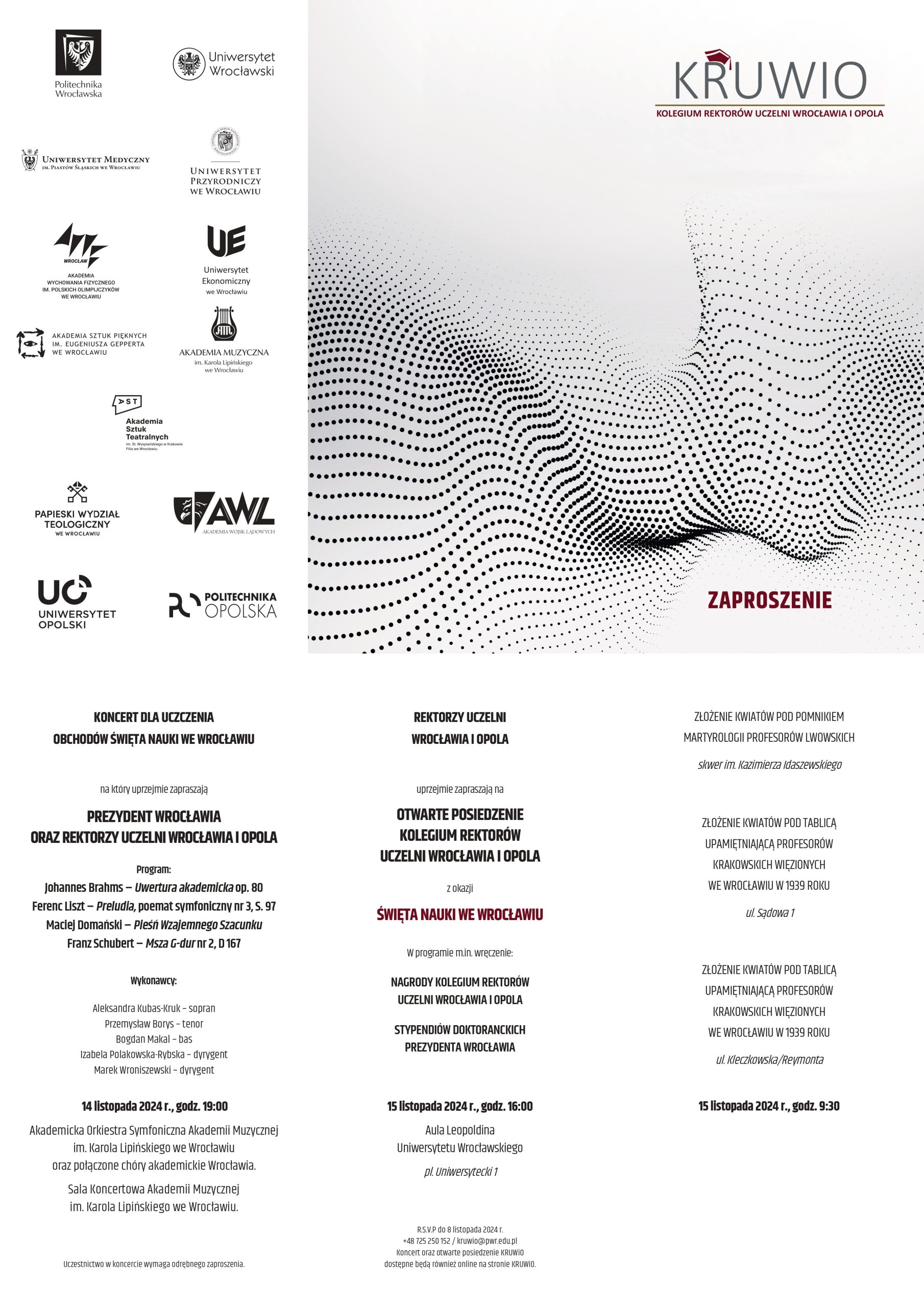 14 (czwartek) i 15 (piątek) listopada o godzinie 19:00 będziecie mogli posłuchać nas na żywo podczas uroczystego koncertu w Sali Koncertowej Akademii Muzycznej im. Karola Lipińskiego we Wrocławiu. W ramach obchodów Święta Nauki organizowanego przez Kolegium Rektorów Uczelni Wrocławia i Opola (KRUWiO) wykonamy Mszę G-dur Franza Schuberta wraz z połączonymi chórami akademickimi Wrocławia, Akademicką Orkiestrą Symfoniczną oraz wybitnymi solistami: Aleksandrą Kubas-Kruk (sopran), Przemysławem Borysem (tenor) i Bogdanem Makalem (bas). Dyrygować będą Izabela Polakowska-Rybska oraz Marek Wroniszewski.